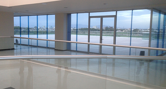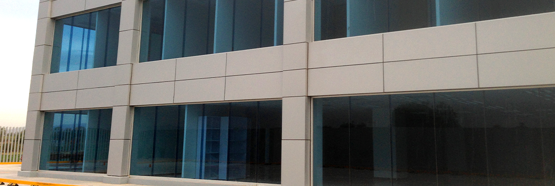 - MATERIALES: Fachada en alucobond azul y gris con cancelerías acústicas, barandales de vidrio templado y pisos en mármol beige, frente de recepción en onyx naranja.